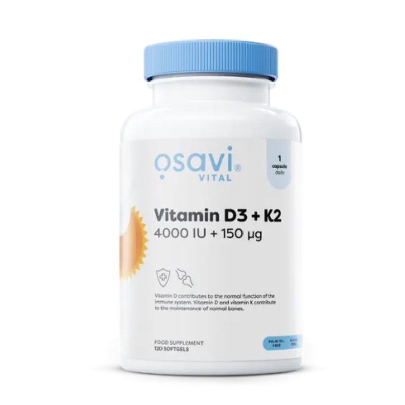 كبسولة جيلاتينية لينة من مكمل غذائي يحتوي على فيتامين د3 (Quali®-D) من مصدر طبيعي وفيتامين ك2 عالي التوافر الحيوي (K2VITAL®) مذاب في زيت جوز الهند MCT. يساهم فيتامين ك2 في الحفاظ على صحة العظام.